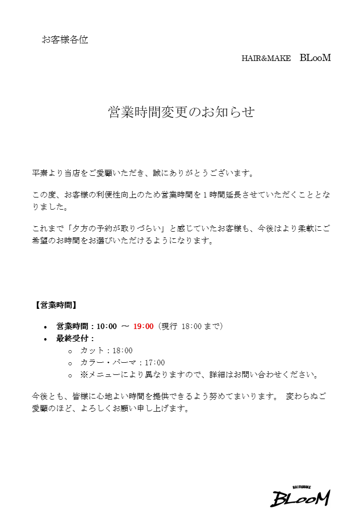 この度、お客様の利便性向上のため営業時間を1時間延長させていただくこととなりました。